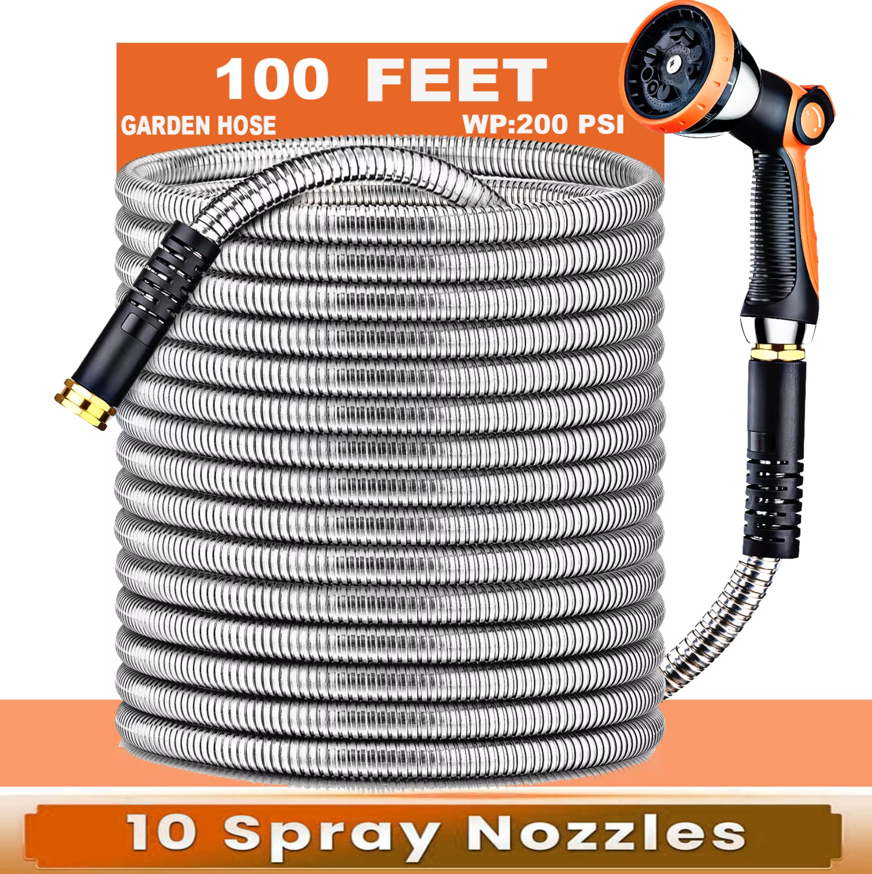 100 ft Metal Garden Hose, Stainless Steel Water Hose with 10 Function Nozzles, No Kinks, Lightweight Hose