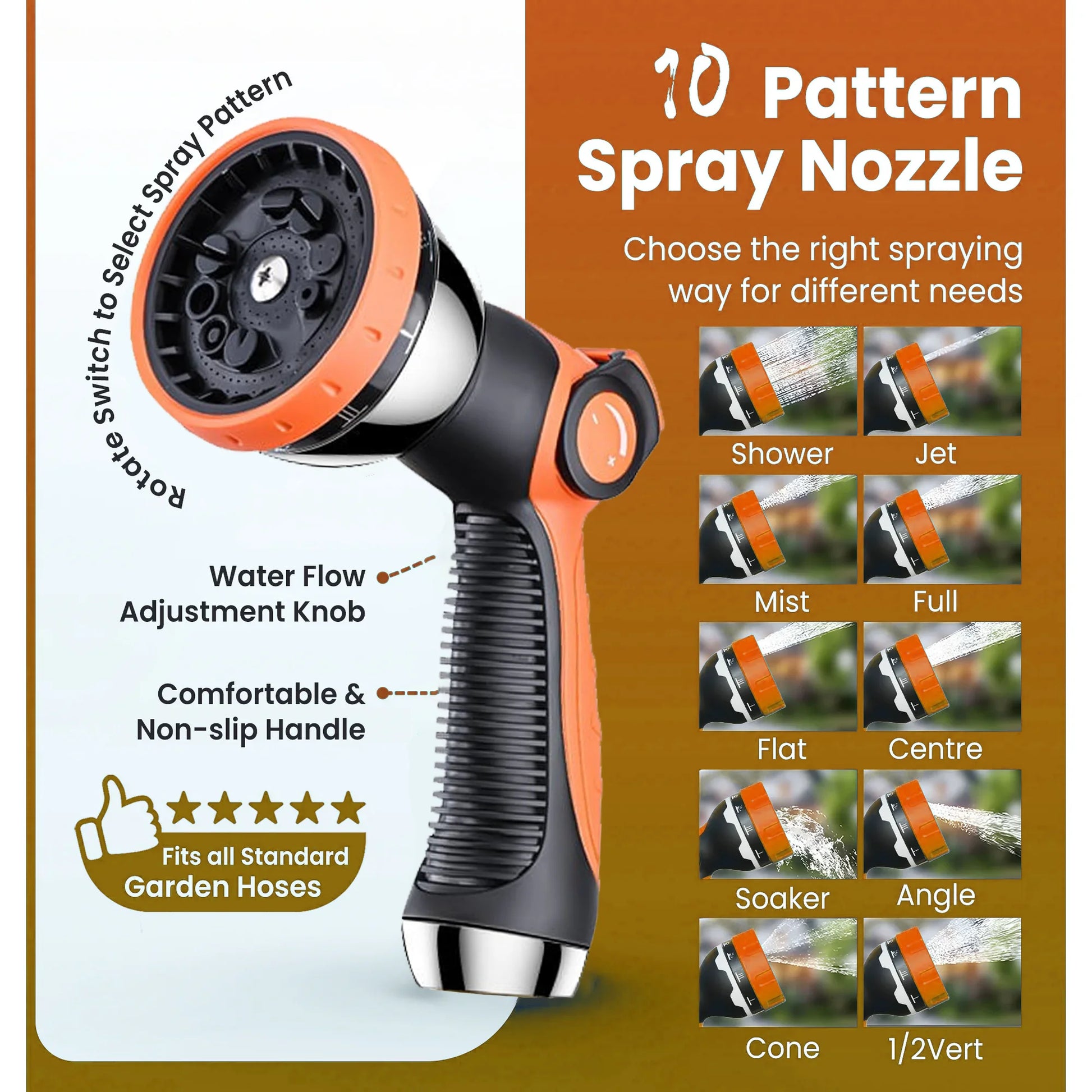 - No Leaks & Free Extra Nozzle:Both ends of the metal garden hose are equipped with newly designed connectors to prevent water leaks. Water hose features a 3/4" aluminum fitting with a sturdy ring design to withstand extreme forces for robust water flow. Rubber gaskets at both ends ensure a leak-proof seal, and three replacements are included for unexpected leaks.The water hose also features an Ergonomic hose nozzle when hand is slip-resistant and comfy with comfortable grip and Rotating bezel for choosing 10 spray patterns.