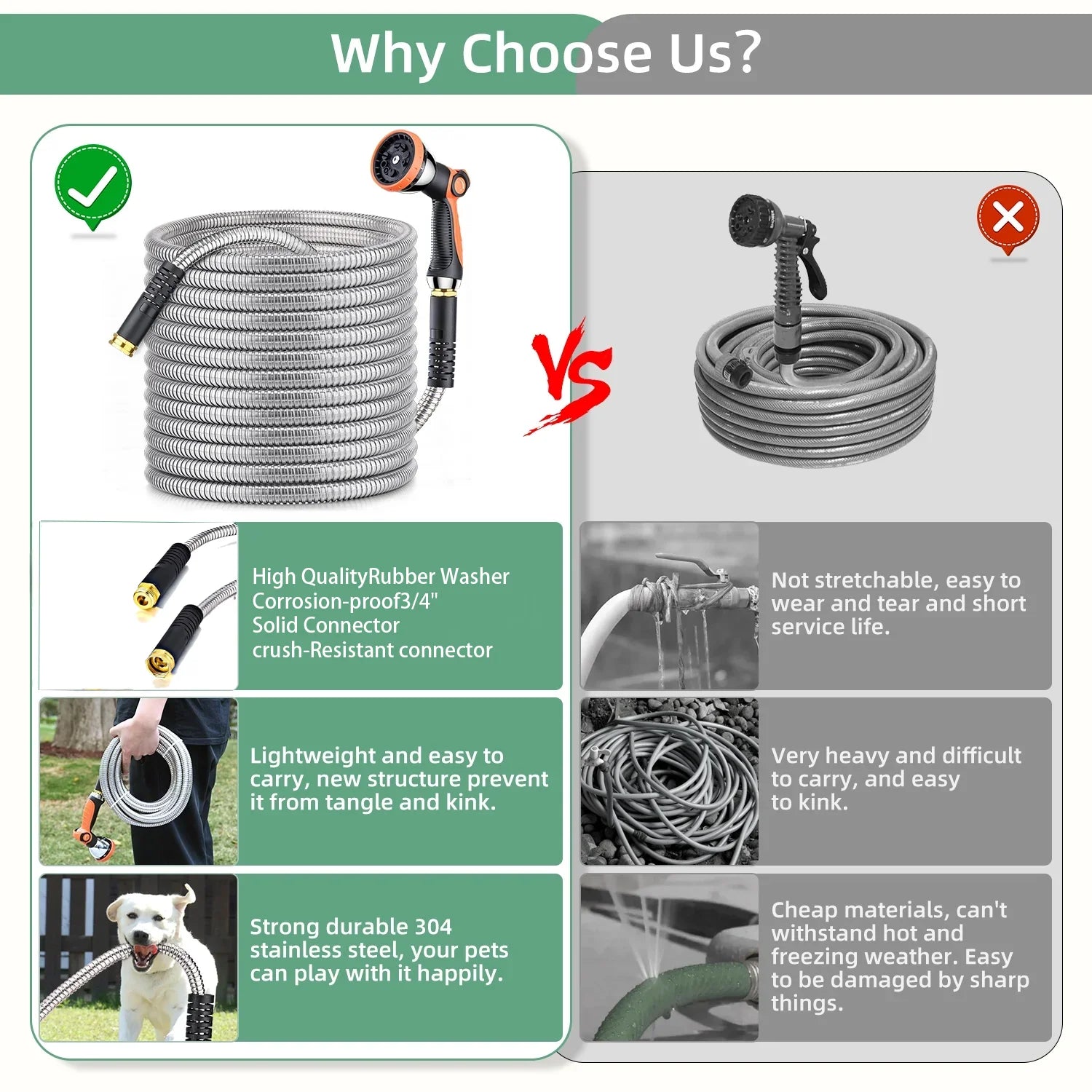- Durable 100FT Garden Hose: Made from strong 304 stainless steel, this hose is tough, elastic, and built to last. It resists cracks and rust, and won't be damaged by animals chewing on it.