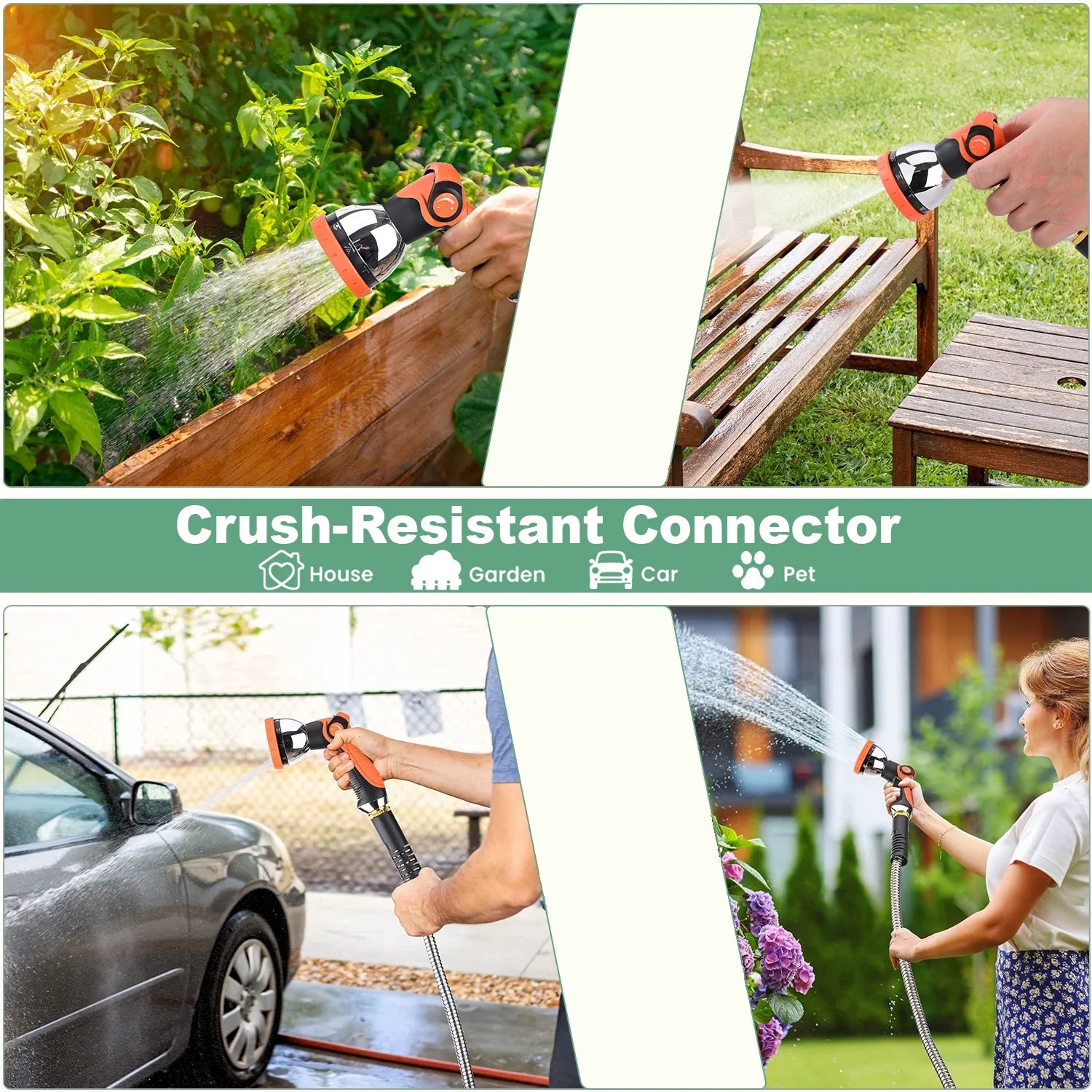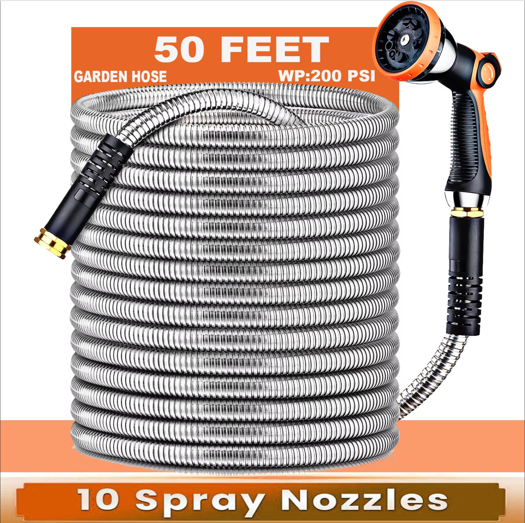50 ft Metal Garden Hose, Stainless Steel Water Hose with 10 Function Nozzles, No Kinks, Lightweight Hose