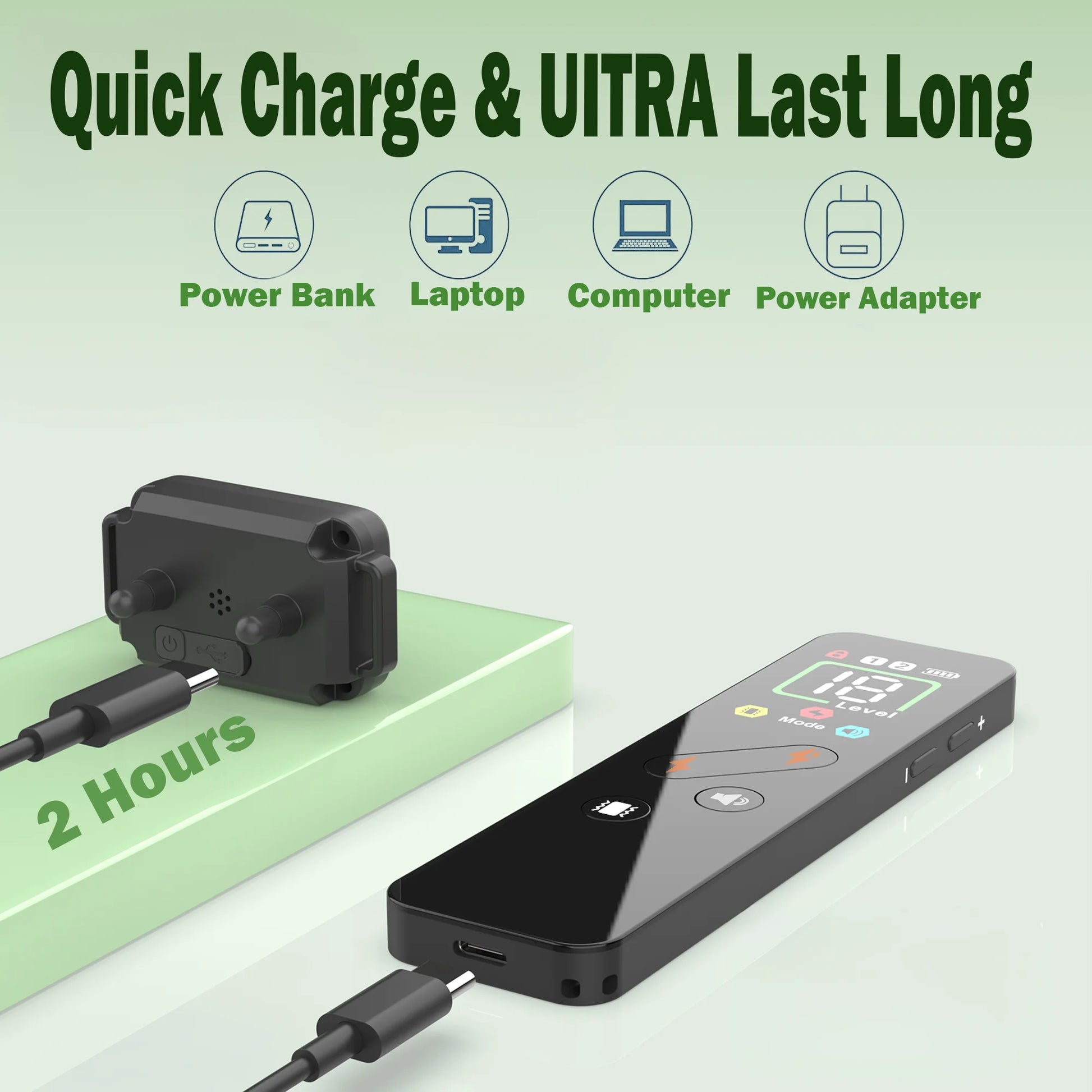 - 【Long-lasting battery life】Only Charge 1-2 Times/Month. The big battery design of the electric dog anti-bark collar is special for going on a road trip, camping adventure, trekking, or any journey. No need to find an extra special charger, it can be fast-charged in 2 hours by any power bank, wall socket, or car socket. You can train your dog continuously during the travels with 45 days long-lasting receiver.