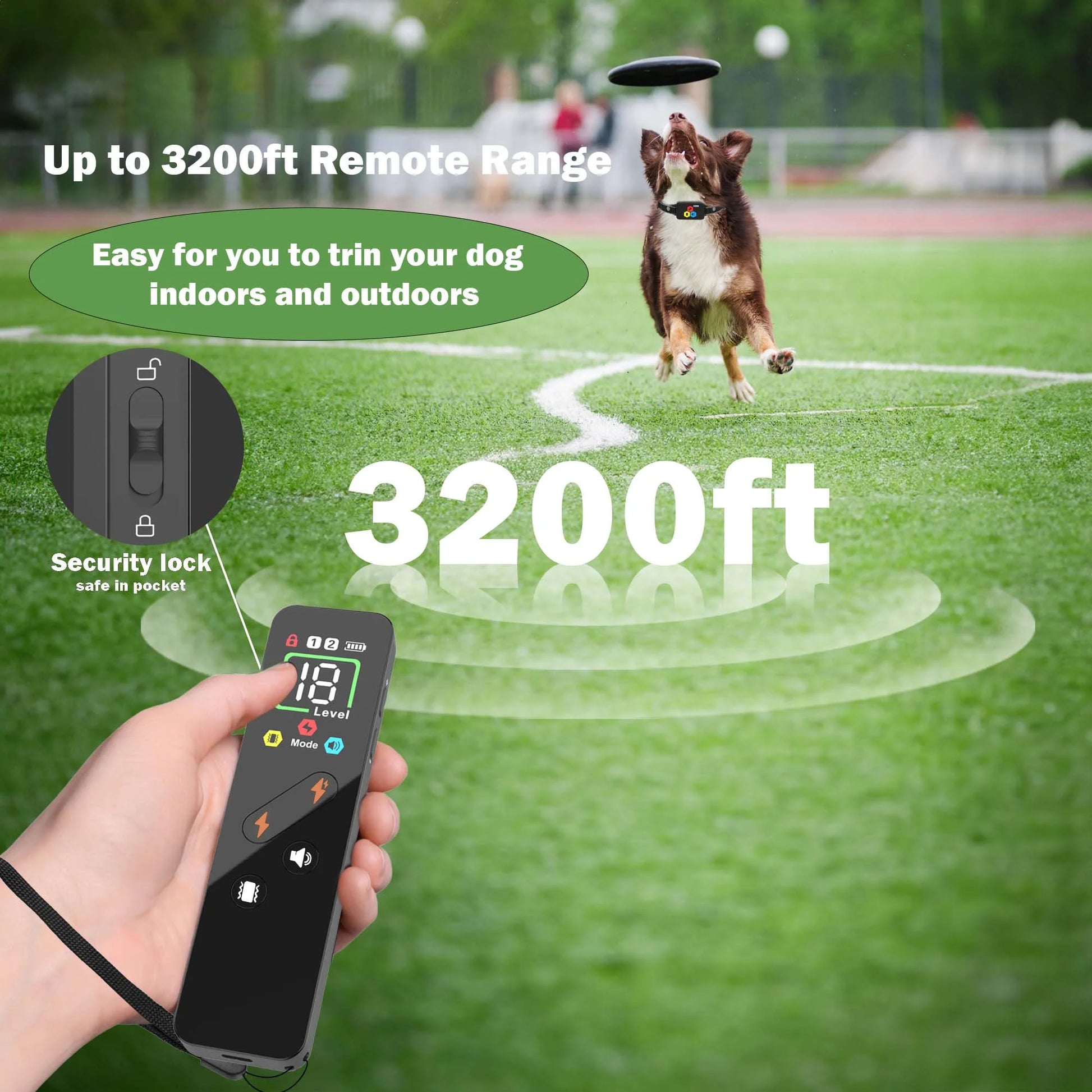 - 【Remote control 3200FT Range and 2 channels】The remote has a range of up to 3200ft, making it easy to train your dog indoors or outdoors. Whether you're in a park, enjoying a camping trip, or simply going for a walk, you can conveniently conduct off-leash, recall, and obedience training, and correct aggression and excessive barking behaviors. With 2-channel, one remote supports 2 receiver collars, and you can train 2 dogs at the same time! Besides, it has a memory function without resetting it.
