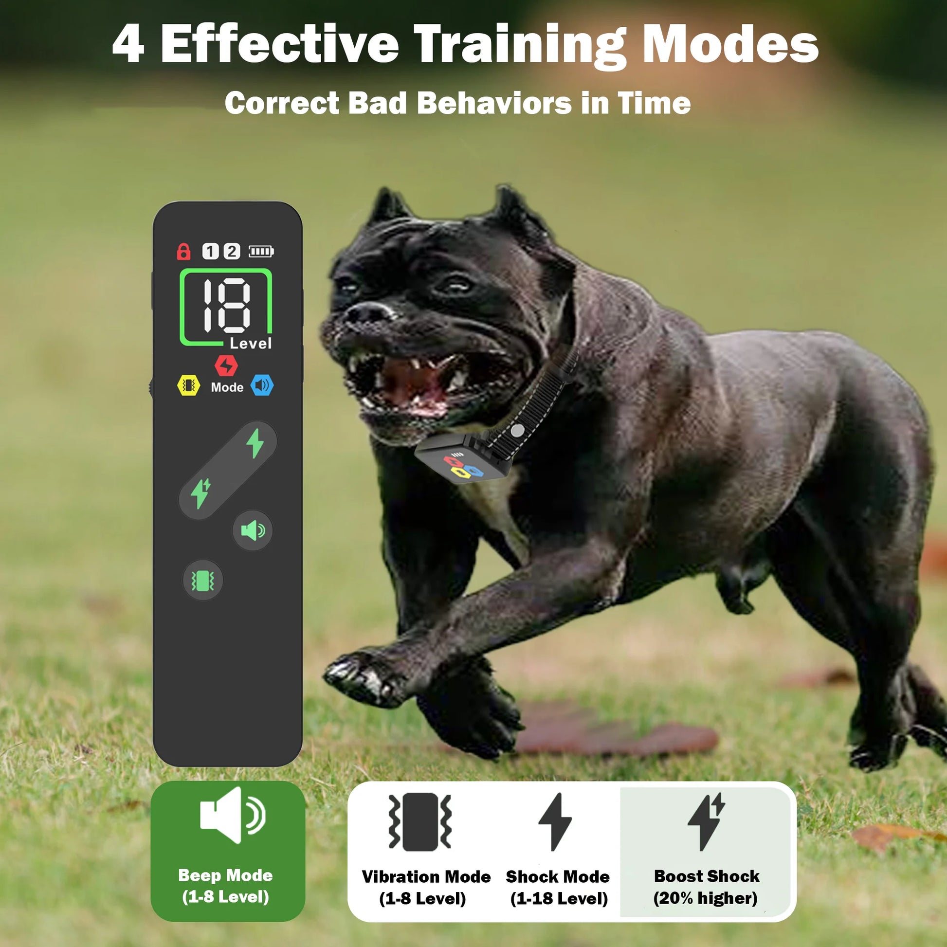 - 【4 Effective Safe Training Modes 】This dog training collar with remote offers 4 adjustable sensitivity training modes: Beep Command(1-8levels); Vibration Command (1-8 levels); Shock Command (1-18 levels); Boost Shock Command (1-18 levels). Adjustable training levels allow for training based on each dog's differences. Adjust the level according to dog's reaction and behavior to meet the needs and abilities. Thus changing your dog's bad habits effectively by using dog training collar.