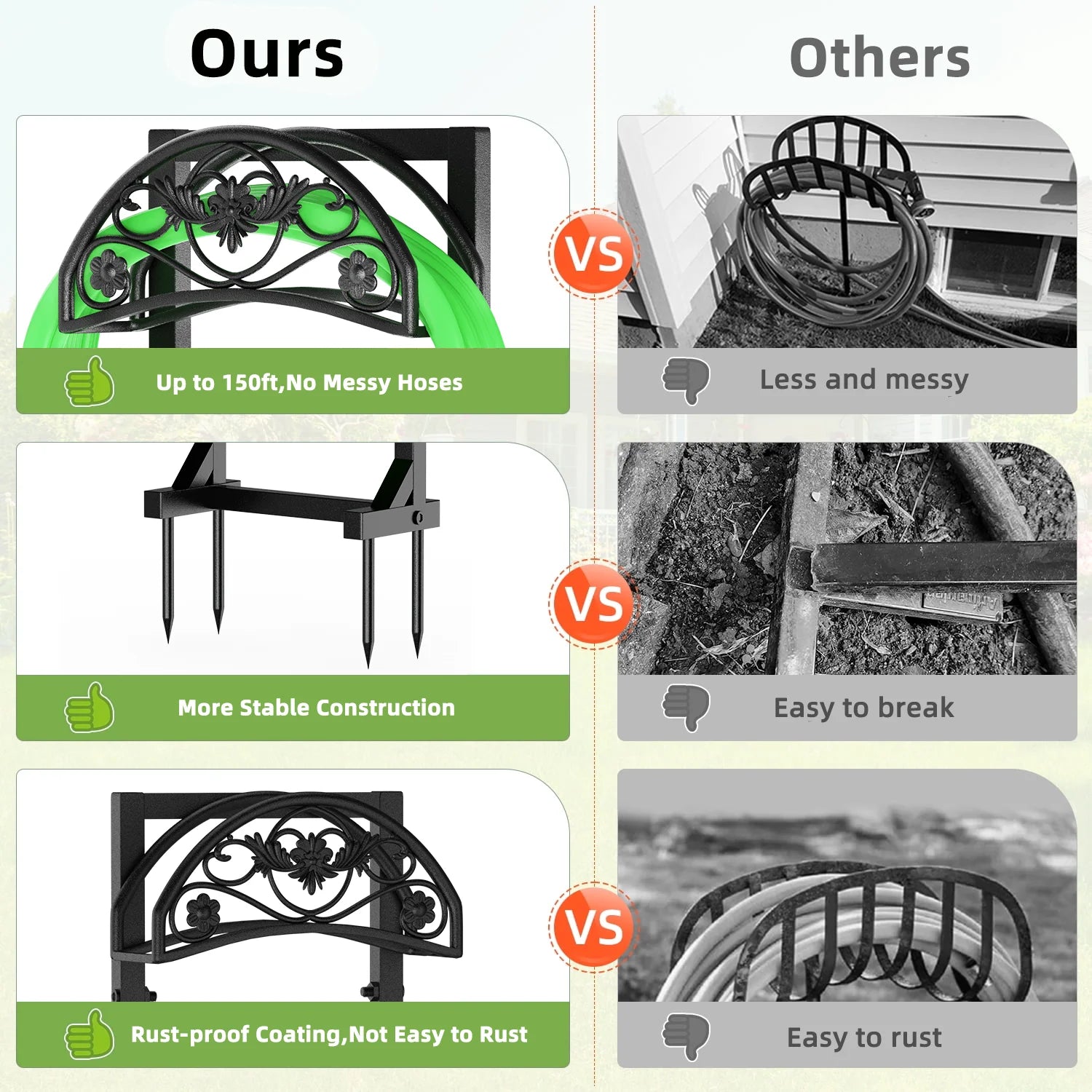 Sturdy Freestanding Design with 4-Point Anchoring SystemOur upgraded garden hose holder features a reinforced base with 4 heavy-duty anchor points and dual support rods, delivering unmatched stability for heavy loads. Engineered to securely hold up to 150 feet of hose without bending or tipping, this freestanding hose holder stays firmly upright even in challenging weather.